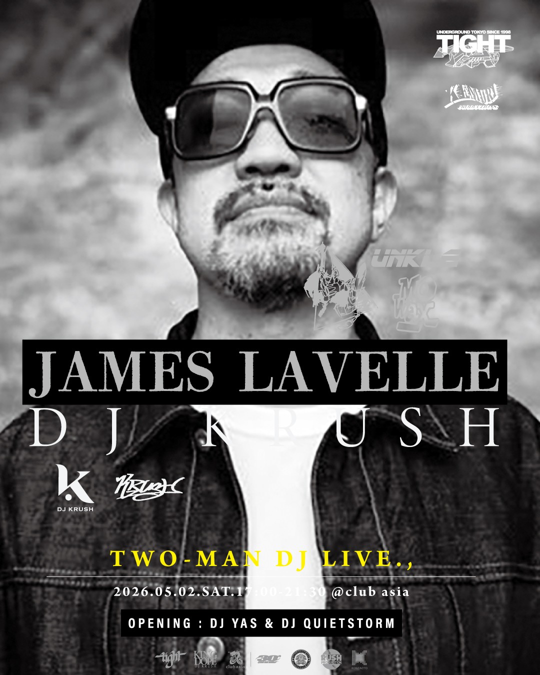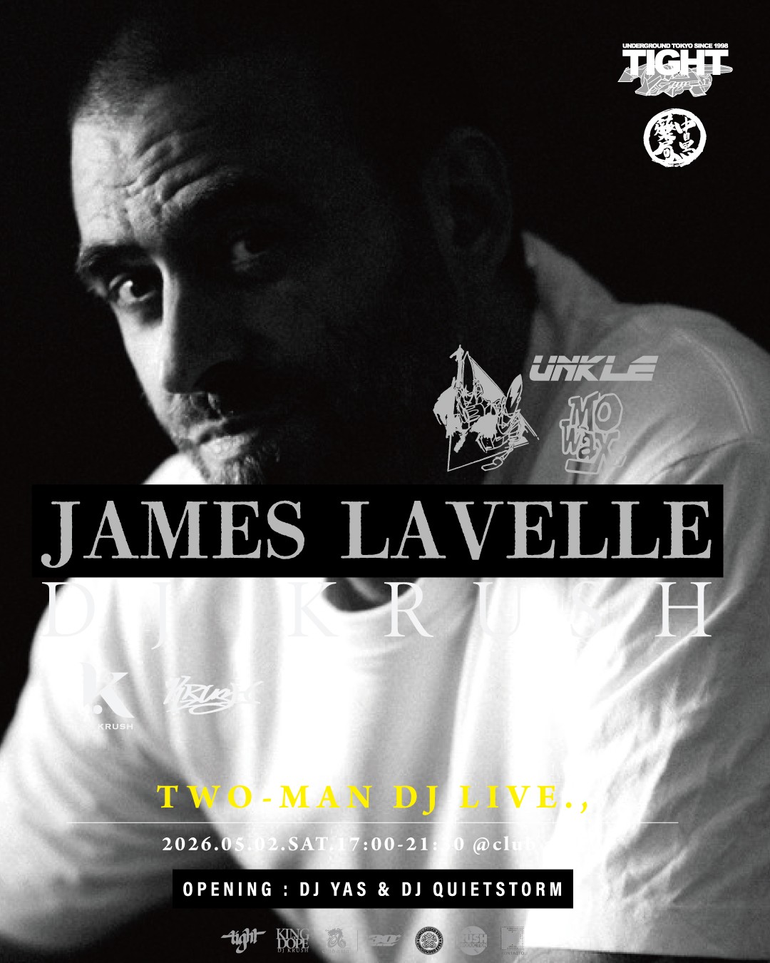 *オープニングには、日本を代表するUNDERGROUND PARTY・TIGHTよりDJ YAS & DJ QUIETSTORMの2人が今回のTWO-MAN DJ LIVEのためのスペシャルセットとして、90年代のシーンを彷彿させるAbstract set・アブストセットにて出演決定。さらに、ジェームスご本人による今回のみのグッズ・Tシャツの販売も!