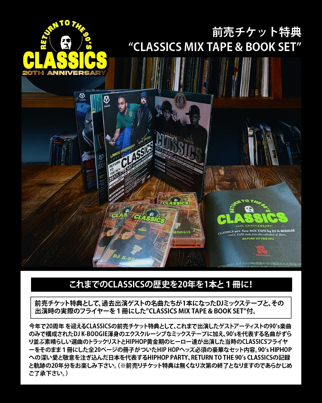 今年で20周年を迎えるCLASSICSの前売チケット特典として、これまで出演したゲストアーティストの90's楽曲のみで構成されたDJ K-BOOGIE渾身のエクスクルーシブなミックステープに加え、90'sを代表する名曲がずらり並ぶ素晴らしい選曲のトラックリストとHIPHOP黄金期のヒーロー達が出演した当時のCLASSICSフライヤーをそのまま1冊にした全20ページの冊子がついたHIPHOPヘッズ必須の豪華なセット内容。