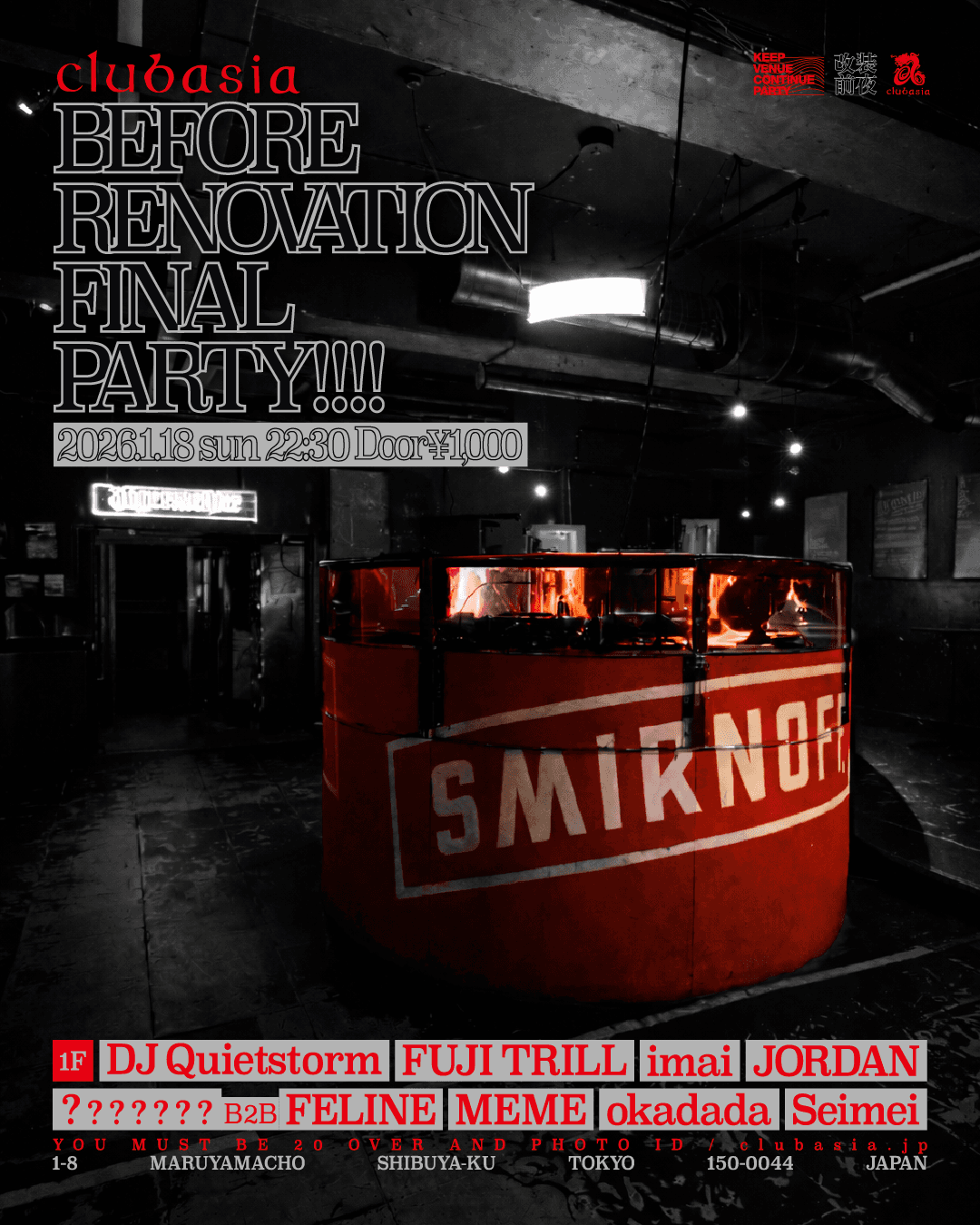 ✸「改装前夜」 改装がアナウンスされ夜な夜なボルテージが高まるclubasia。解体が始まるその瞬間まで終わらないパーティーで全てを見届けよう ────────。